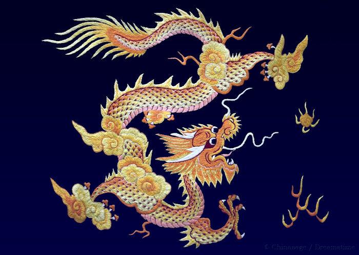 At the time that the legendary Cadmus was sowing dragon’s teeth in ancient Greece to give birth to the fierce race of Thebans 2,500 years ago, the Chinese were already venerating dragons and like the Thebans, some believed that they themselves were descended from dragons. Depictions of the dragon go back at least 6,000 years. A dragon is said to be made up of nine different creatures: camel (head), deer (horns), rabbit (eyes), cow (ears), snake (neck), frog (belly), carp (scales), hawk (claws) and tiger (palm). It has whiskers, a beard and eighty-one (9x9) scales running down its spine. The repeated use of nine comes from its use as the imperial number. As the dragon is so powerful, auspicious and benevolent it came naturally to be associated with the emperor. In the yin-yangsystem of opposites a dragon is the epitome of yang: male, active and strong. The emperor ruled from the ‘Dragon Throne’ and a dragon was his emblem on the Chinese flag.